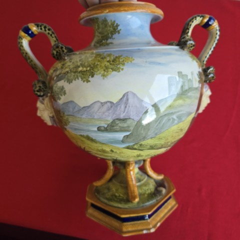 Grand vase avec des anses figurant des serpents entrelacés et une scène de la mythologie grecque et un paysage de lac à l'arrière. Sur l'arrière du pied il est ébréché à trois endroits, voir photo.